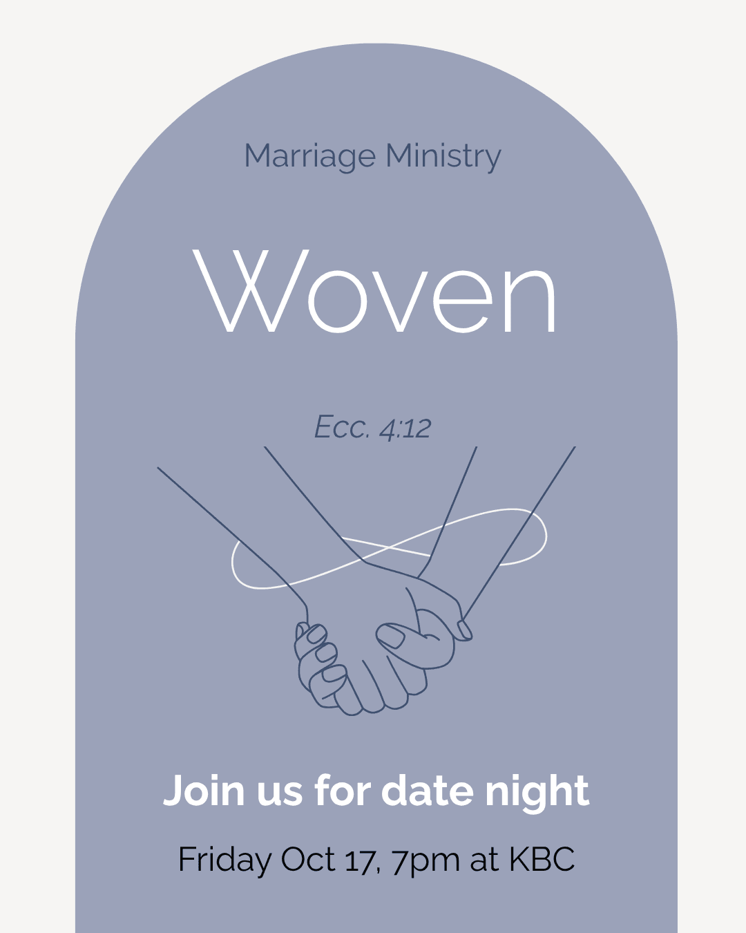 Join us on October 17, 2025 from 7:00pm-8:30pm at KBC for W.O.V.E.N, a married couples' night out! This free, "date night" is designed for couples to have intentional time together as they invest in a Biblical marriage. Hear core teaching then enjoy chatting over dessert and praying together. Daycare is provided free of charge. All stages of marriage welcome.